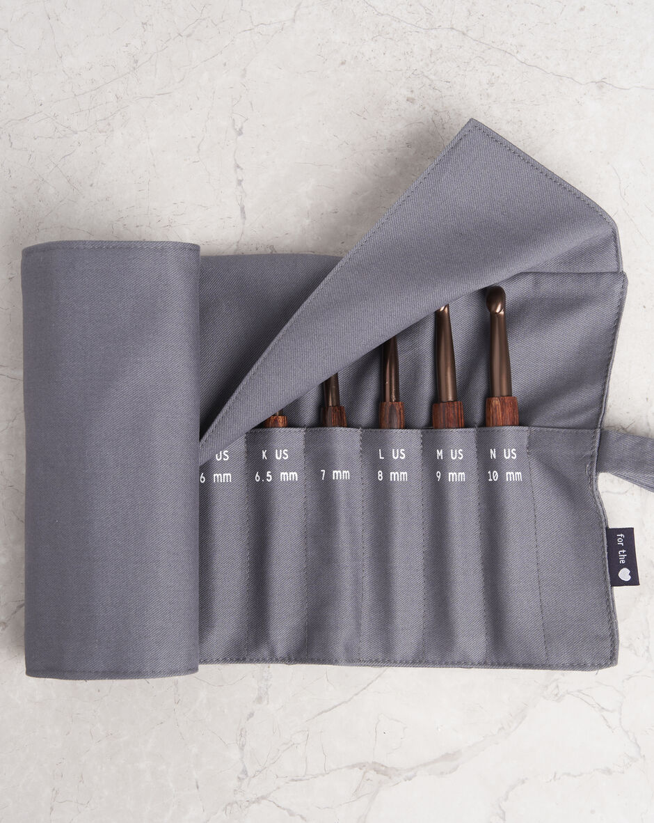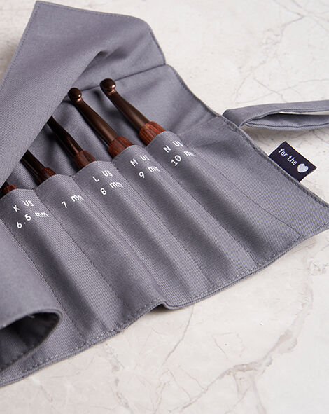 Our crochet hook rolls contain all the pockets you could possibly need - and more! The individual pockets are labelled with mm/US hook sizes plus an extra zipped pocket for any notions. These rolls are perfect to carry with you for travel, or just to have stashed in your craft nook for organizational purposes. The crochet hook roll measures 47cm wide and 29 cm deep and is co-branded with the della Q and Rowan logos.
